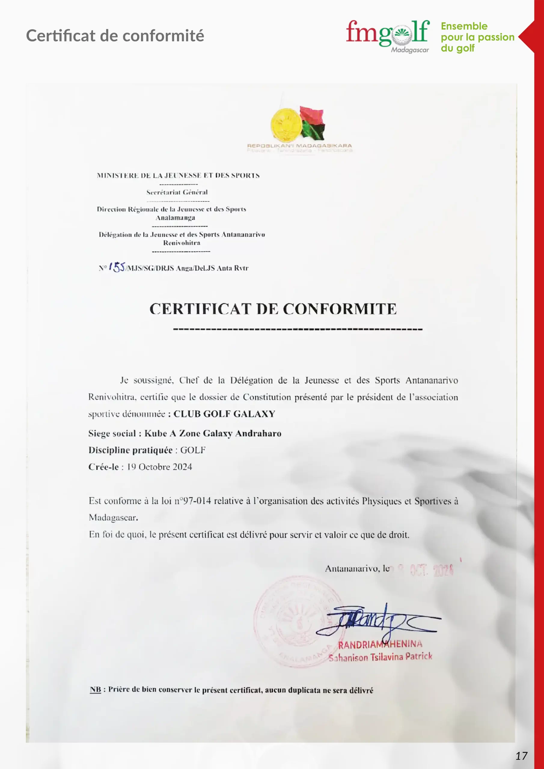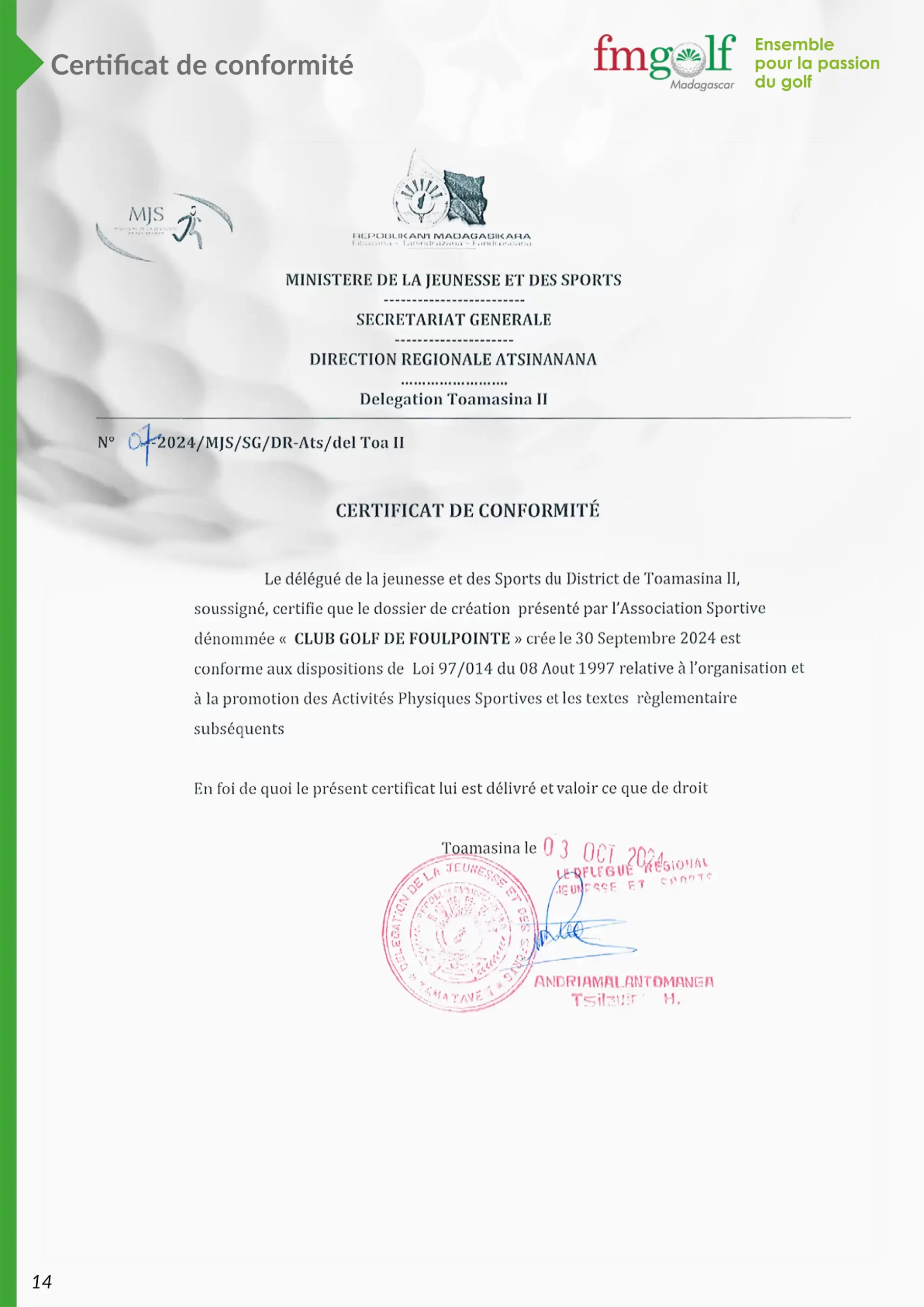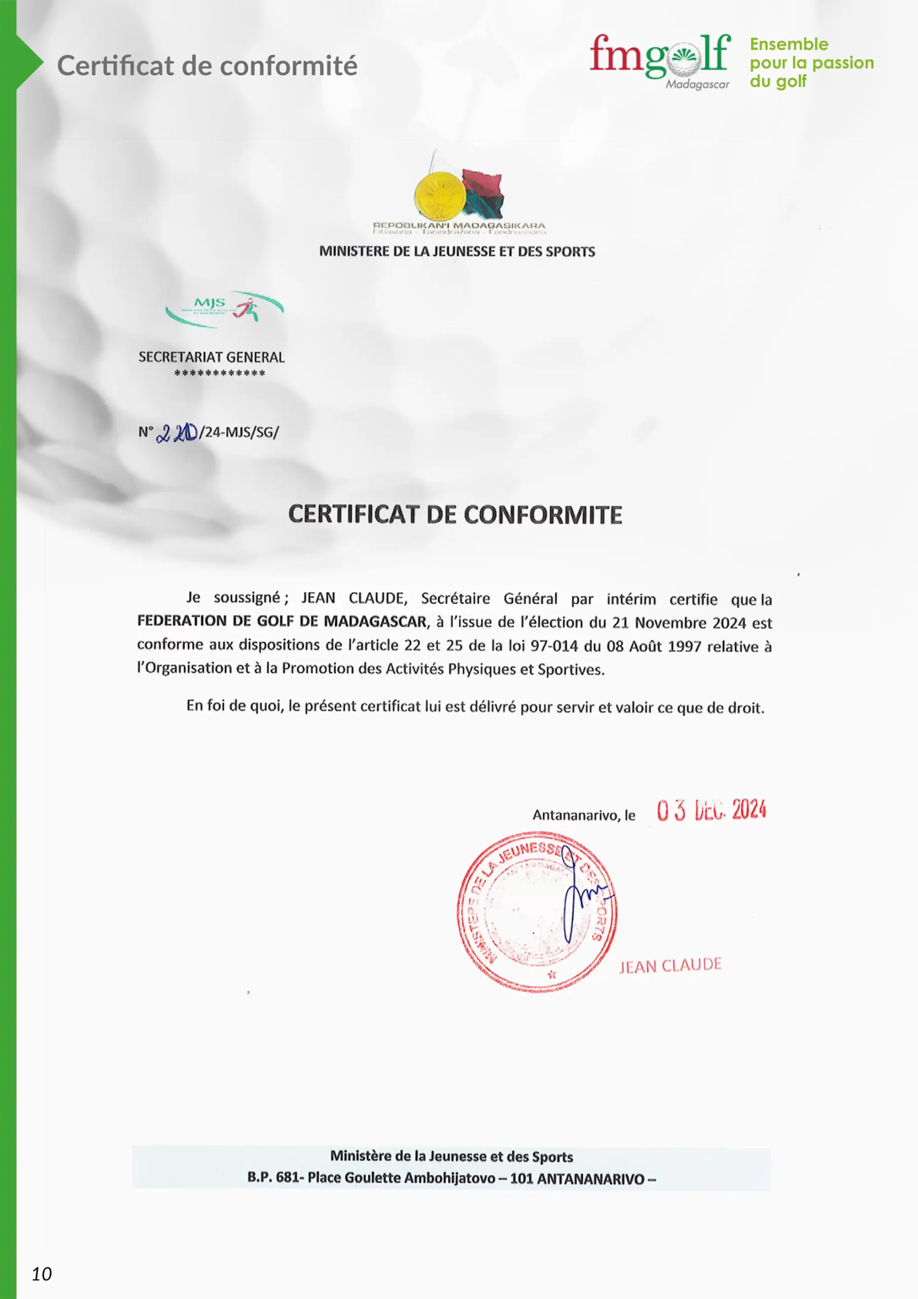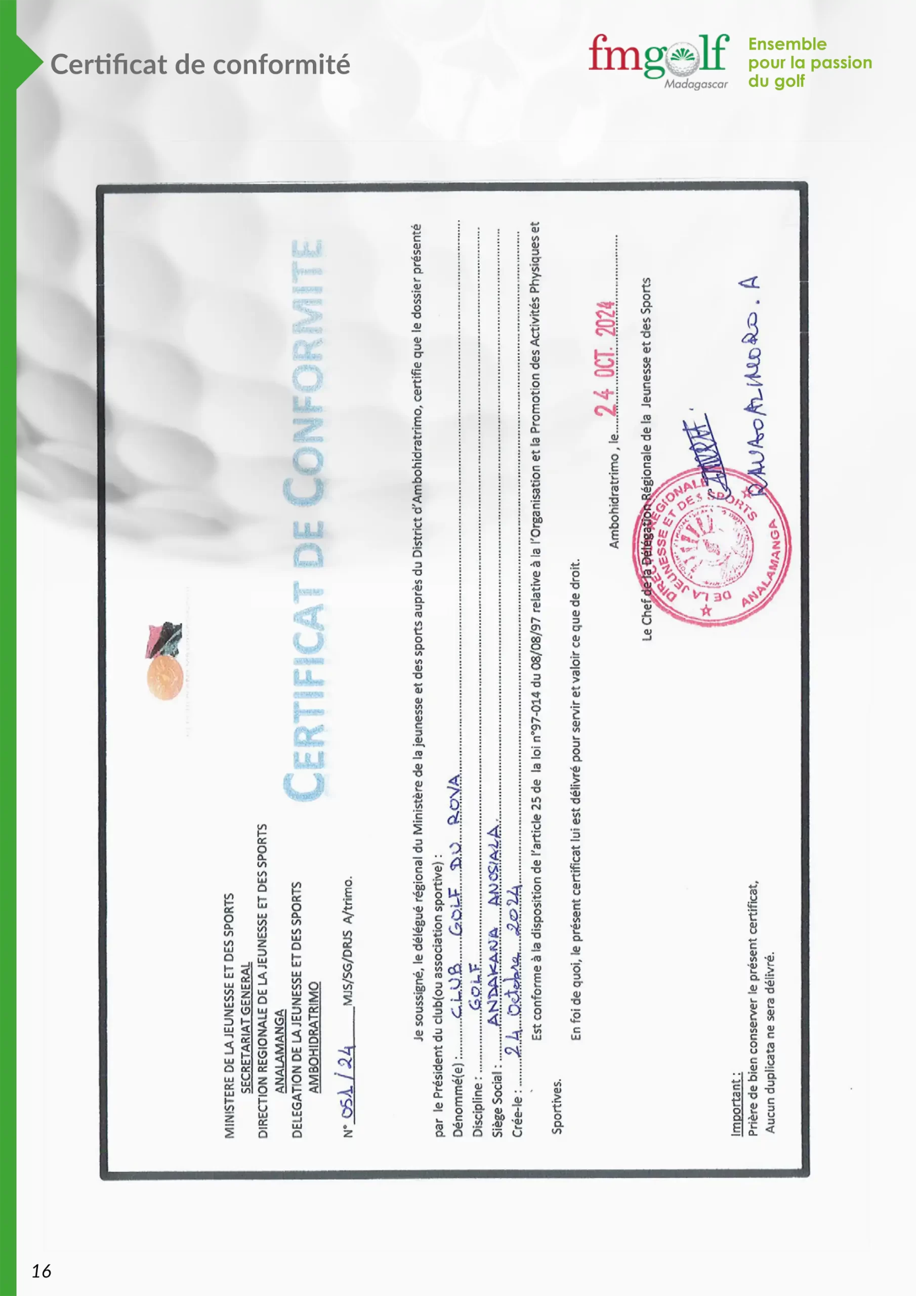 Certificat de conformité Fédération Malagasy de Golf
