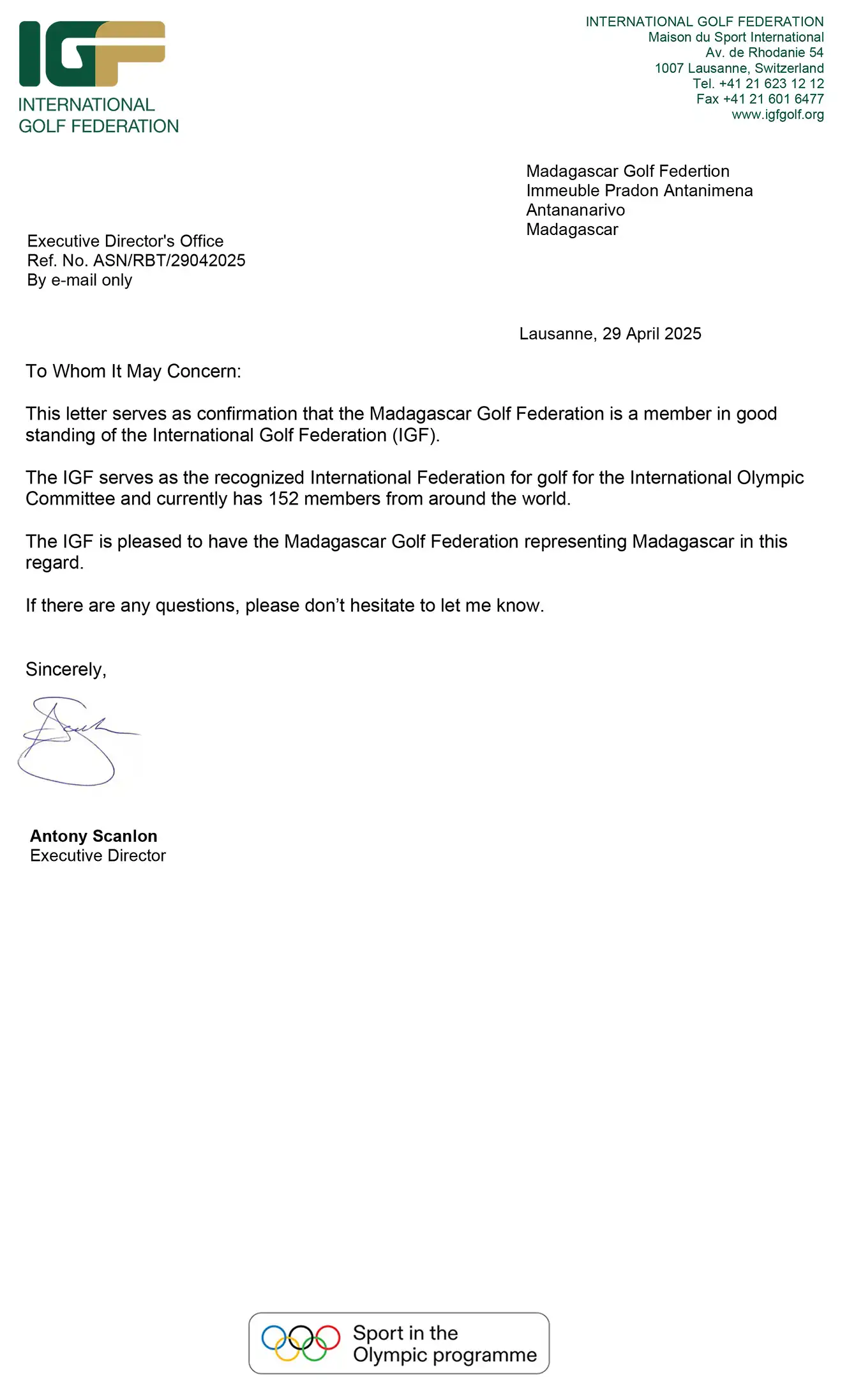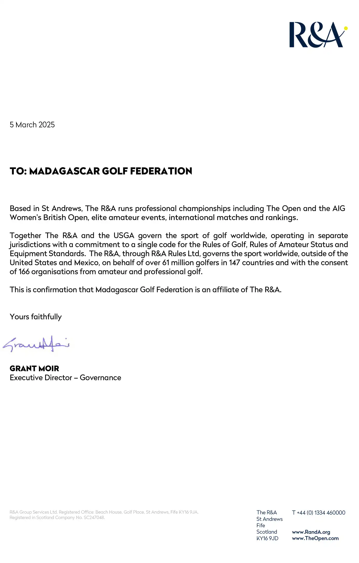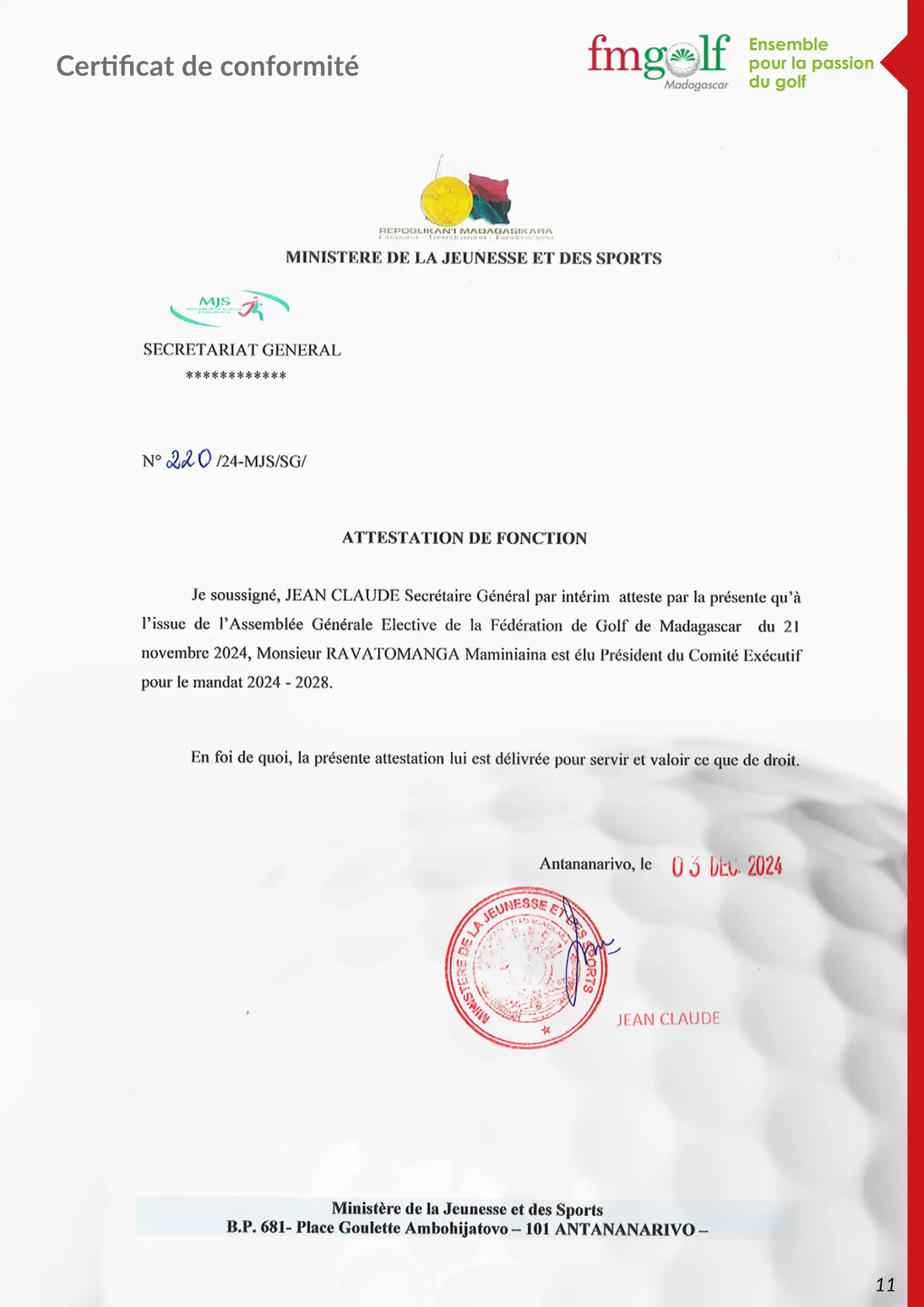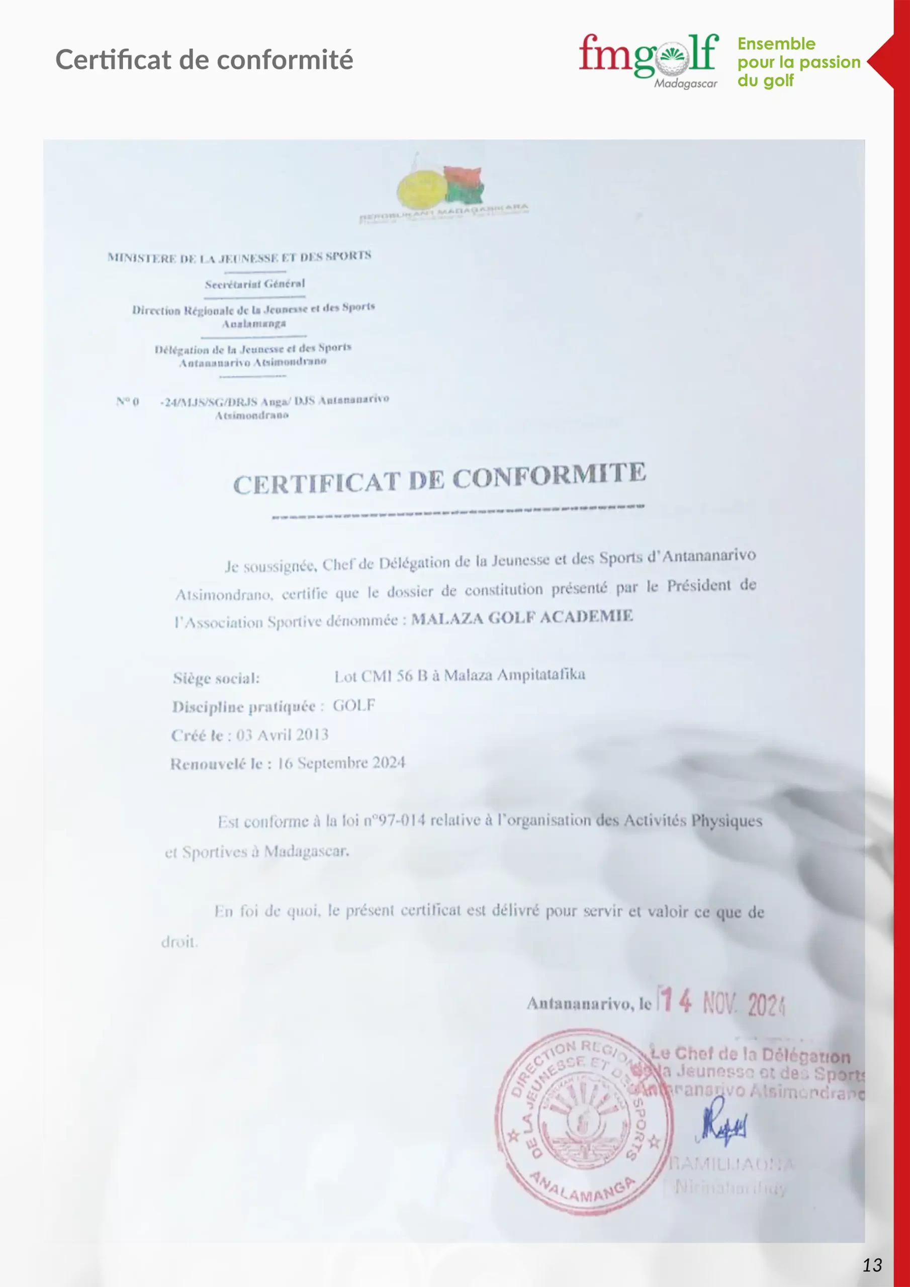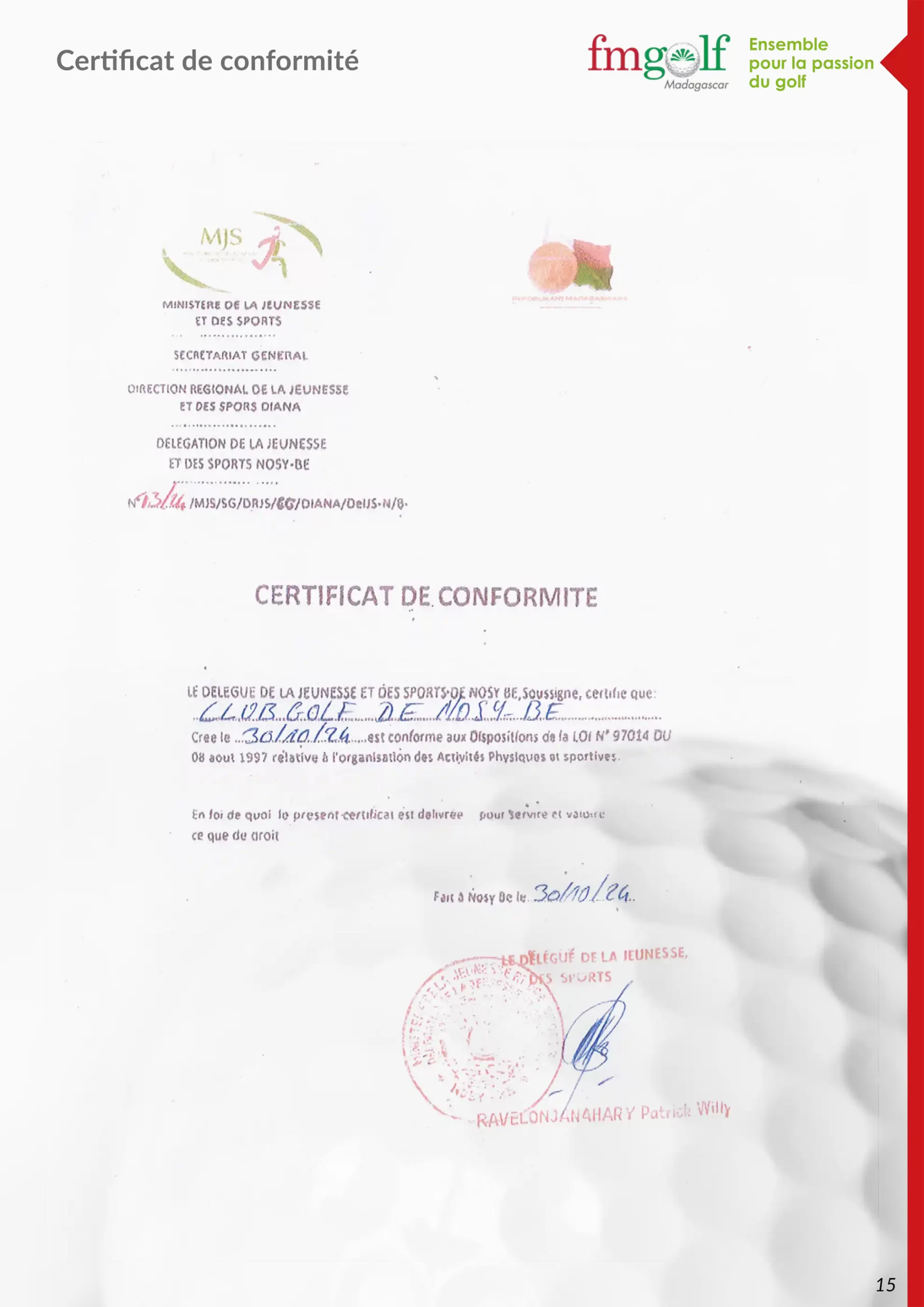 Certificat de conformité Fédération Malagasy de Golf